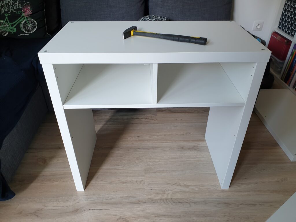 To achieve this, I had to saw the side support panel of the drawer insert in half, and instead of installing the middle shelf of the Kallax in its usual central position, I aligned it closer to the upper section.