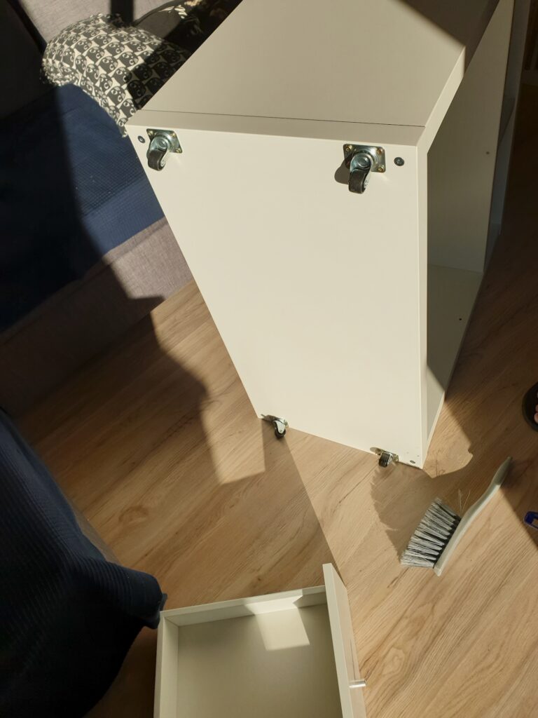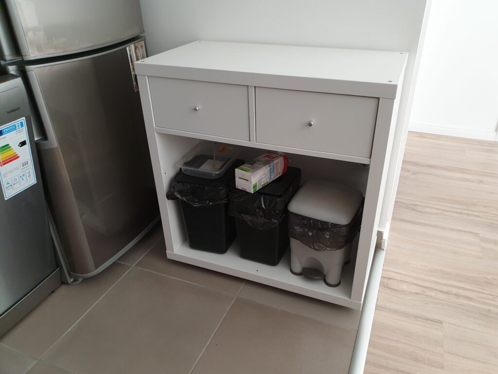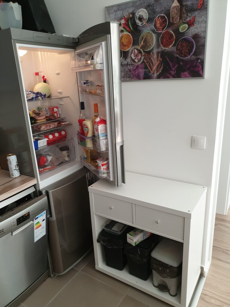 This way, we got a small but functional work surface, two small drawers, and enough space underneath the drawers to finally place the trash bins. But where would it fit? The only possible spot was in front of the fridge, so that’s where it ended up.